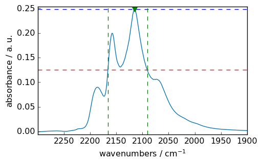 Once a given maximum has been approximately located manually with the mouse, it is possible to obtain [markdown] For instance, after zooming on the highest peak of the last spectrum, one finds that it is located at ~ 2115.5 cm\(^{-1}\). The exact x-coordinate value can be obtained using the following code (see the slicing tutorial for more info):