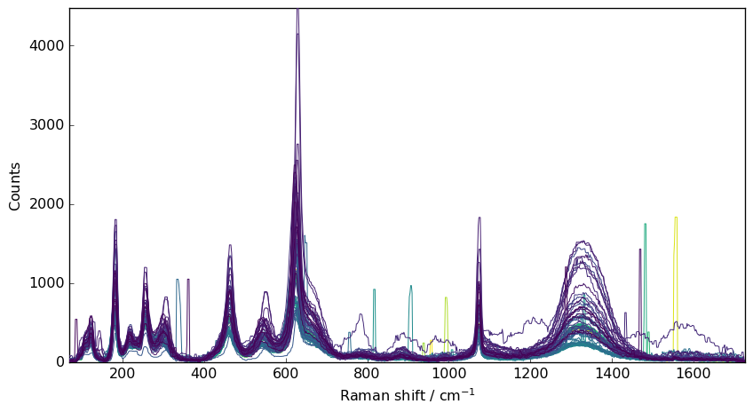 e.g., let’s take a series of Raman spectra for demonstration: These spectra present both a significant noise and cosmic rays spikes.