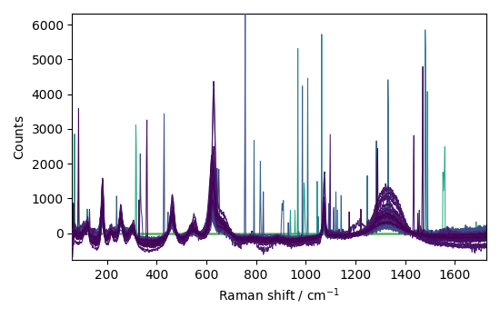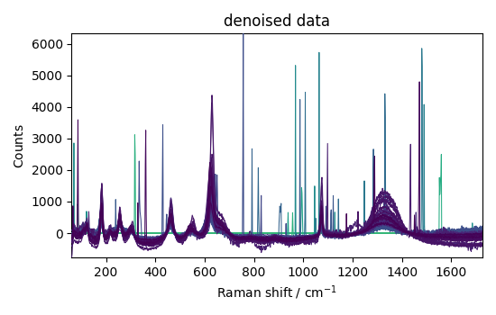 This ends the basic example of denoising a 2D Raman spectrum. scp.show() # uncomment to show plot if running from a script sphinx_gallery_thumbnail_number = -1