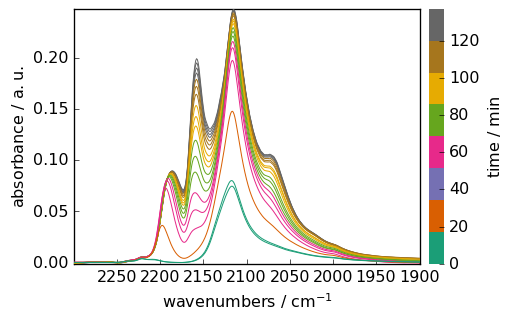 It should be noted that this method finds only true maxima, not shoulders (!). For the detection of such underlying peaks, the use of methods based on derivatives or advanced detection methods - which will be treated in separate tutorial - are required. Once their maxima of a given peak have been found, it is possible, for instance, to plot its evolution with, e.g. the time. For instance for the peaks located at 2220-2180 cm\(^{-1}\):