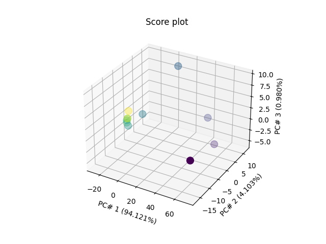 <Axes3D: title={'center': 'Score plot'}, xlabel='PC# 1 (94.121%)', ylabel='PC# 2 (4.103%)', zlabel='PC# 3 (0.980%)'>