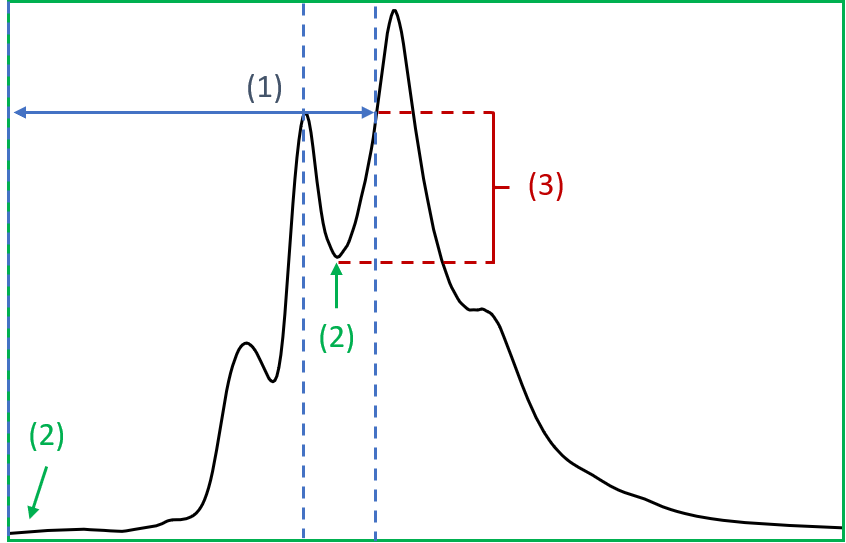 This estimate is based on an algorithm similar to that used for the “bases” above, except that the horizontal line starts from a width_height computed from the peak height subtracted by a fraction of the peak prominence defined bay rel_height (default = 0.5). The algorithm is illustrated below for the two most prominent peaks: