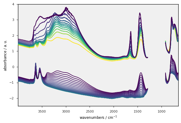 For sake of demonstration we import a NDDataset consisting in infrared spectra from an omnic .spg file and make some (optional) preparation of the data to display (see also Import IR Data).